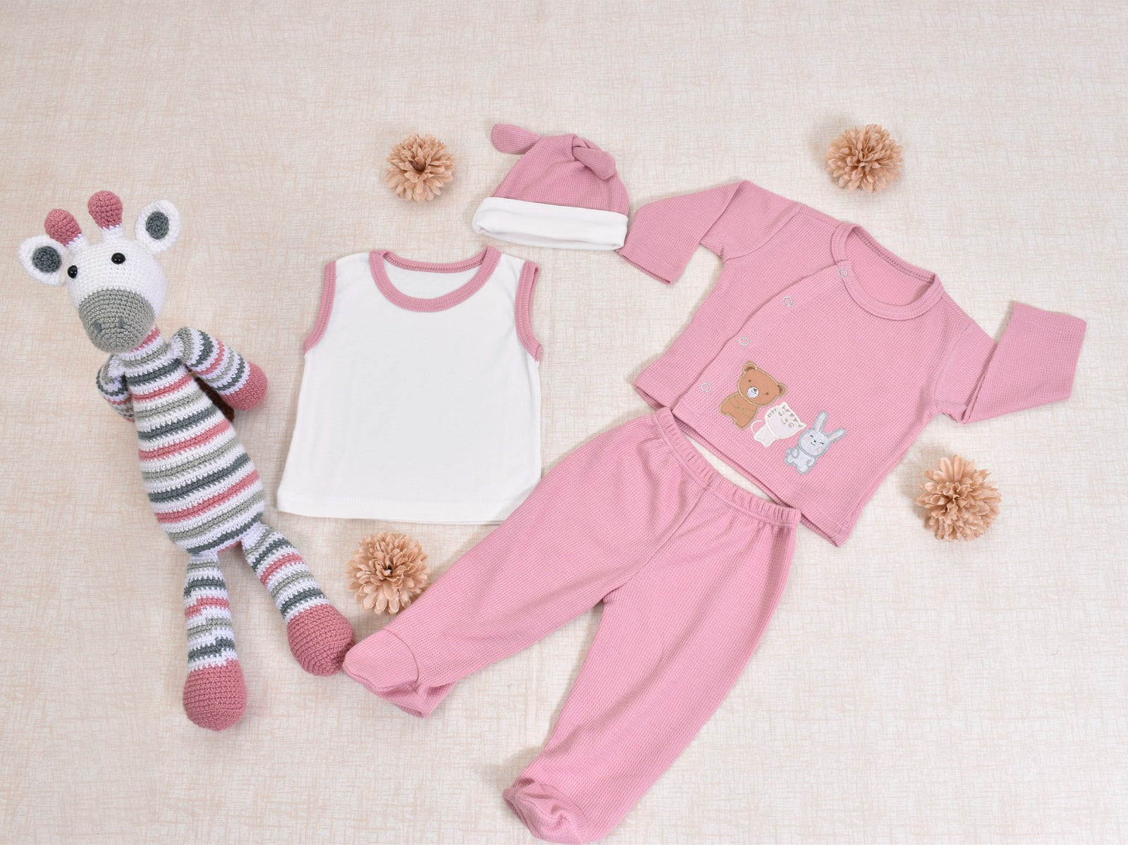 Incluye: 1 buzo con bordado, 1 camisilla, 1 gorrito tipo nudo,1 pantalón con pies cerrados