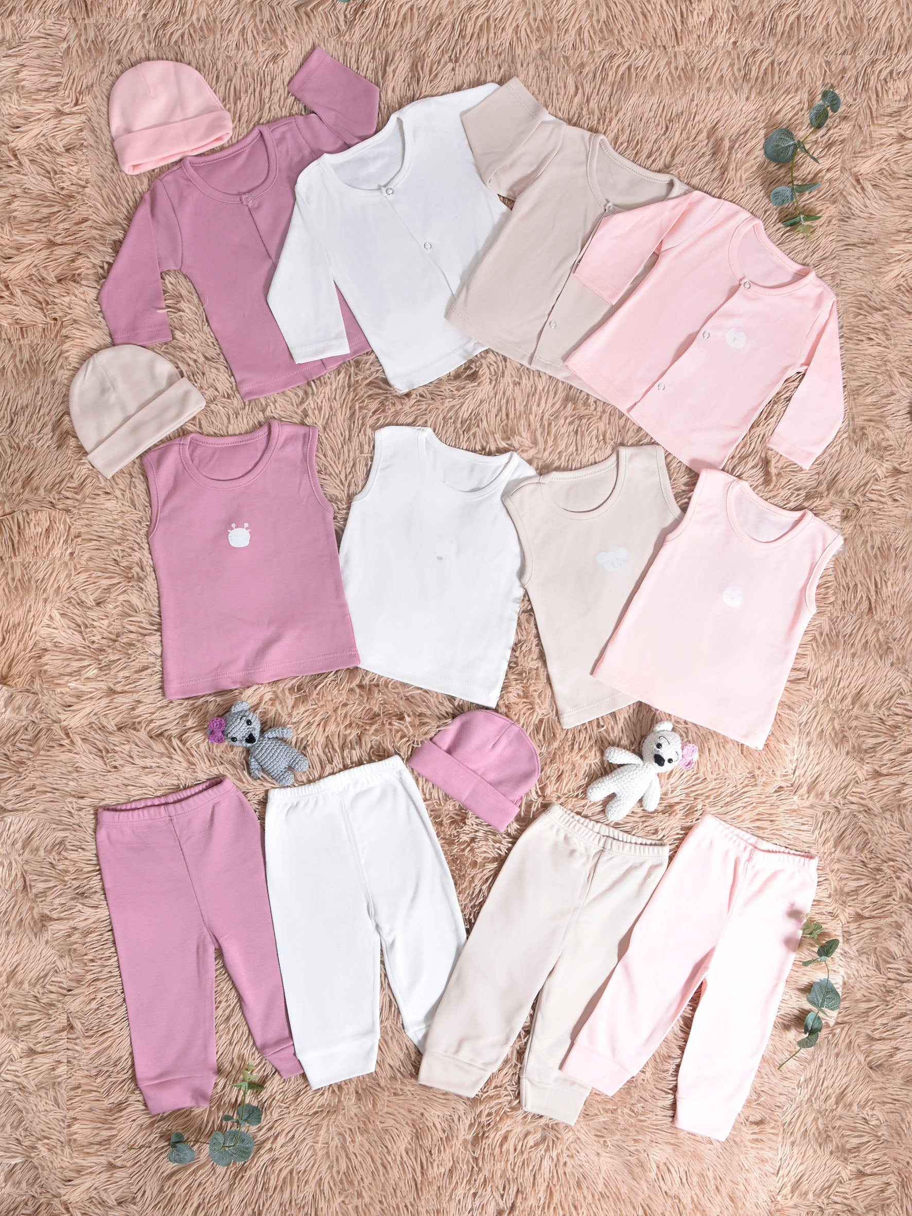Contenido 16 prendas : 4 buzitos, 4 camisillas, 4 gorritos, 4 pantalones